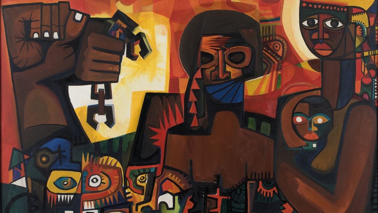 Two raised fists, one clenching a broken chain, emerge triumphant on the left side of the canvas, referencing not only the African American struggle for equality but the worldwide independence movement in the 1960s of countries previously under colonial rule. LeRoy Clarke painted Now shortly after moving to New York from Trinidad and Tobago, which achieved independence in 1962. The painting speaks to the urgency of Clarke’s mission: “I paint with an intention for revolution . . . . I paint for enlightenment, to bring us closer to parting the darkness and opening up the way to our origins.”